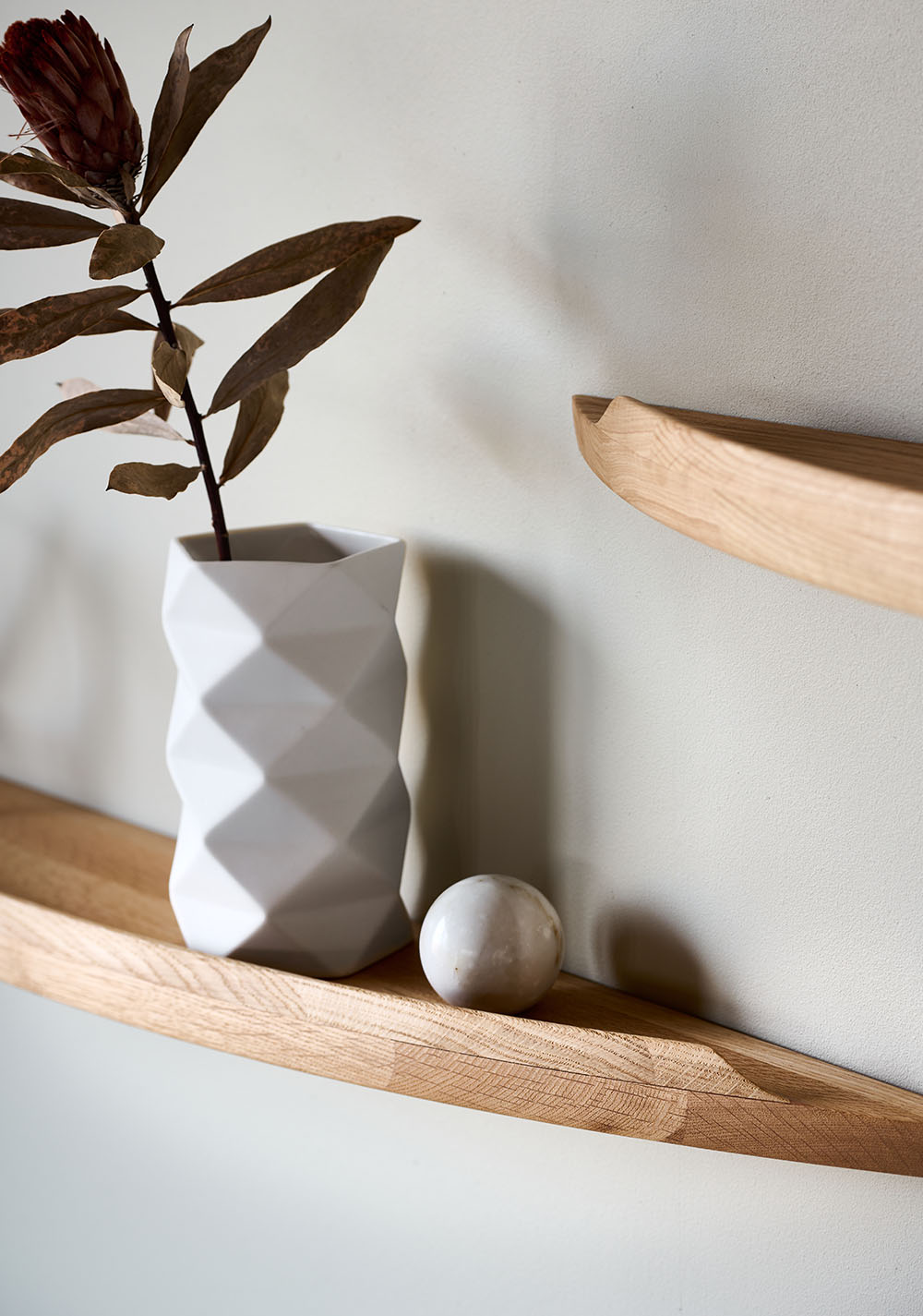 Whether you have chosen your Arcus Shelf in white oiled oak, smoked stained oak or natural oiled oak, this guide ensures correct and secure hanging. With the right installation, the elegant profile edge and organic shapes of the shelf are highlighted, making it a natural work of art on your wall.