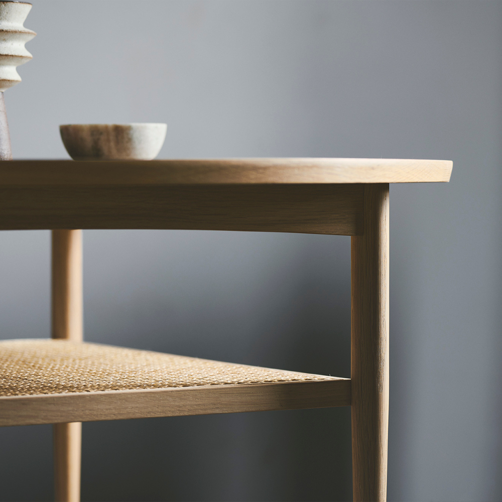 The round tabletop and the square magazine shelf in French cane are brought together by the table's other details, such as the soft curve from the apron. No.100 is a typical expression of Jørgen Aakjær Jørgensen's design DNA, where contrasts are played with and attention is paid to details, but where simplicity and functionality are the dominant parameters for the final result.