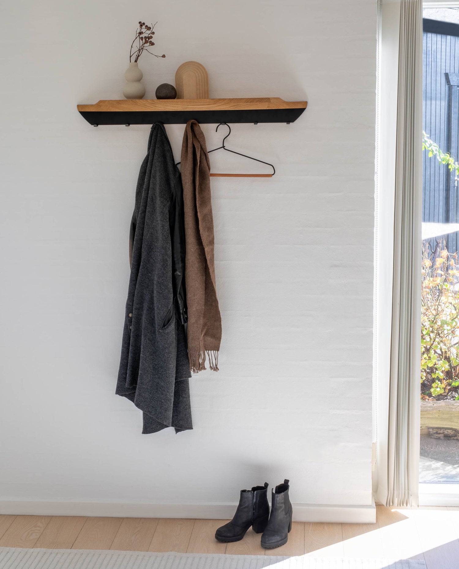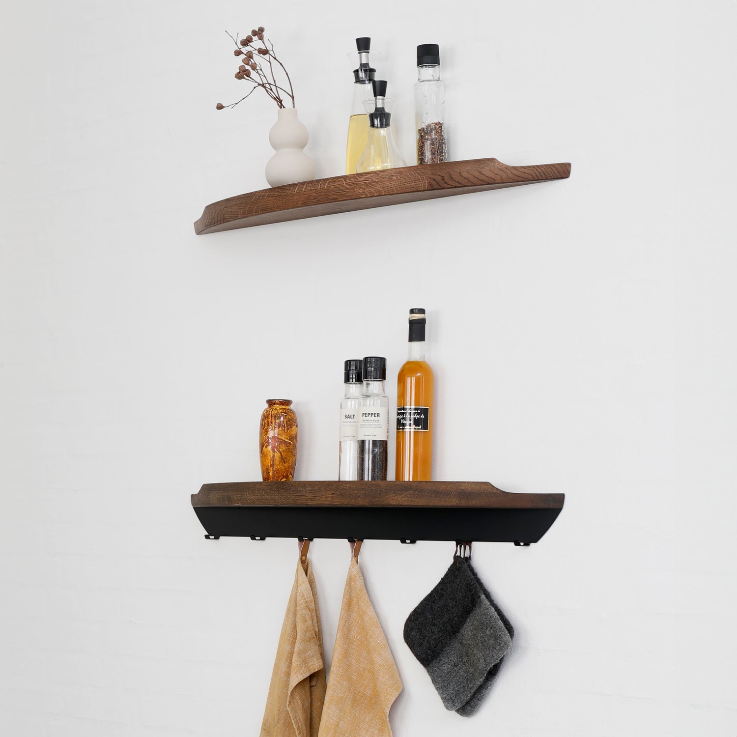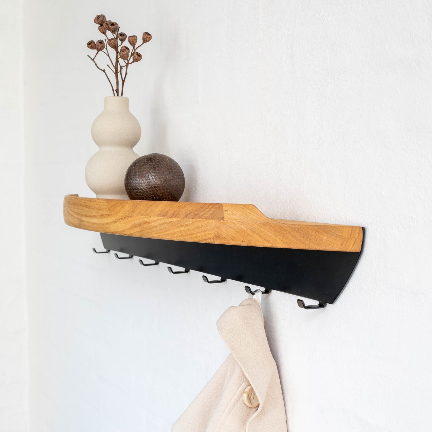 Arcus Hanger er ikke kun forbeholdt entréen – den fungerer lige så smukt i soveværelset eller køkkenet. Brug den til at hænge tøj, viskestykker eller grydelapper, mens Arcus Shelf ovenover giver plads til at fremvise krydderurter, olier eller små dekorative genstande. Et fleksibelt design, der bringer orden, varme og æstetik til hverdagens rum.